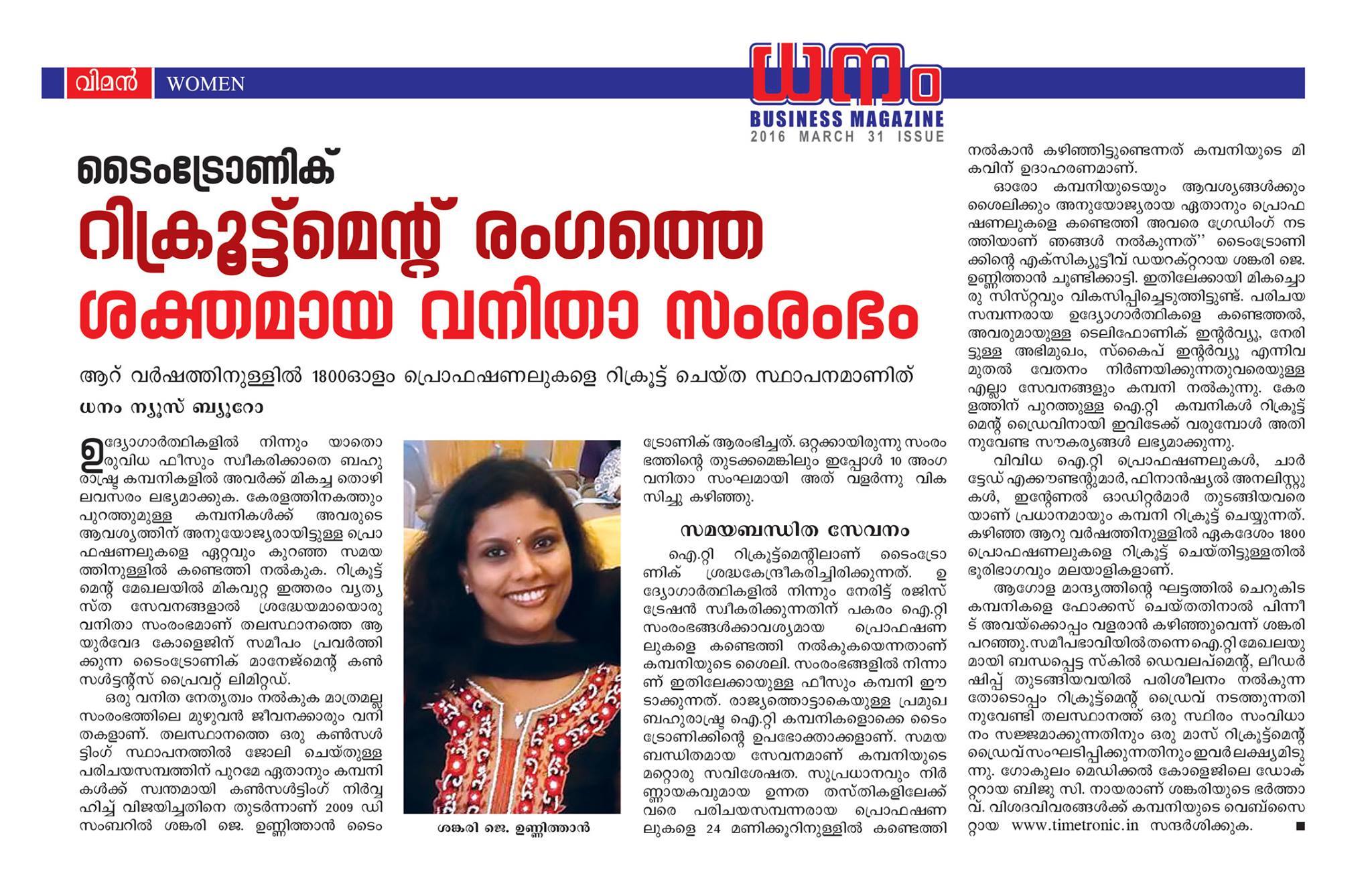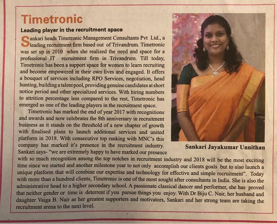 Sankari J Unnithan founded Timetronic Management Consultants Private Limited. Timetronic starts operating from a car shed with just one employee. Located in Trivandrum as IT recruitment firm that quickly evolved into one of India’s first all women recruiters IT recruitment firm.